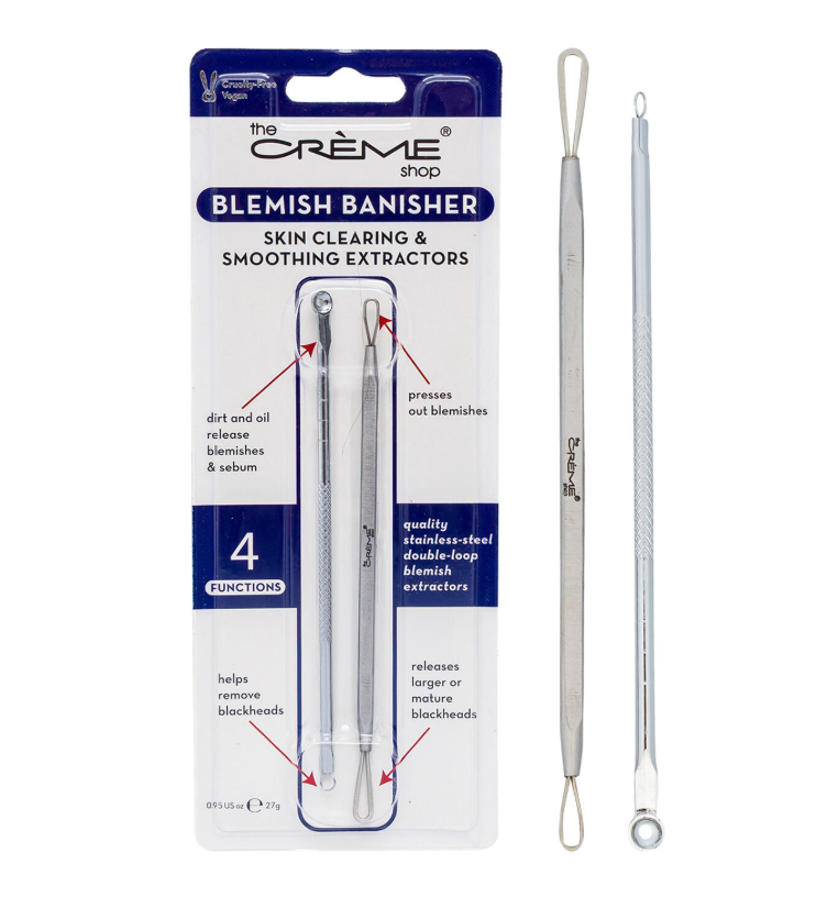 The Creme Shop Blemish Banisher Extractors are precision tools crafted to effectively remove clogged pores, acne, and blemishes. Featuring sealed stainless steel construction, these extractors are a key component of The Creme Shop’s Blemish Banisher collection, designed to promote a clearer, healthier complexion. Ideal for those seeking a professional-grade solution to manage and reduce blemishes with confidence.