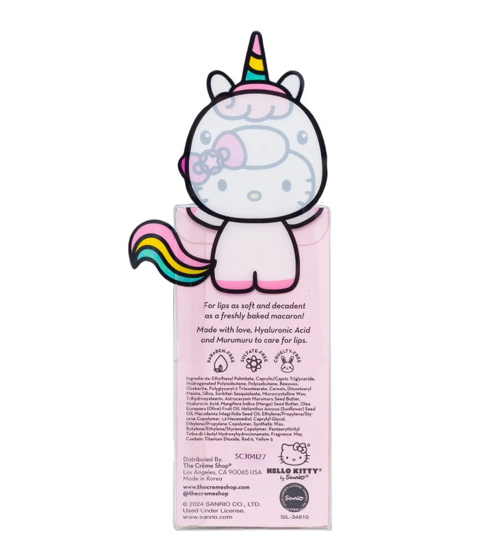 Indulge dry lips with this charming Hello Kitty lip balm, designed in a distinctive macaron shape. Formulated with nourishing Vitamin E and hydrating Shea Butter, this creamy balm delivers lasting moisture, enhanced by the sought-after Sweet Sprinkles fragrance.